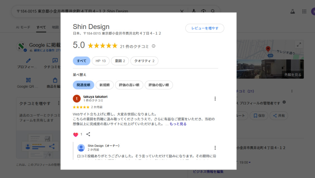 大変嬉しい事に徐々に口コミも増え、今では20件以上の口コミを投稿してもらうができました。口コミは自分自身のモチベーションにも繋がりますので、これからも口コミ投稿が増えていけば良いと思っております。
